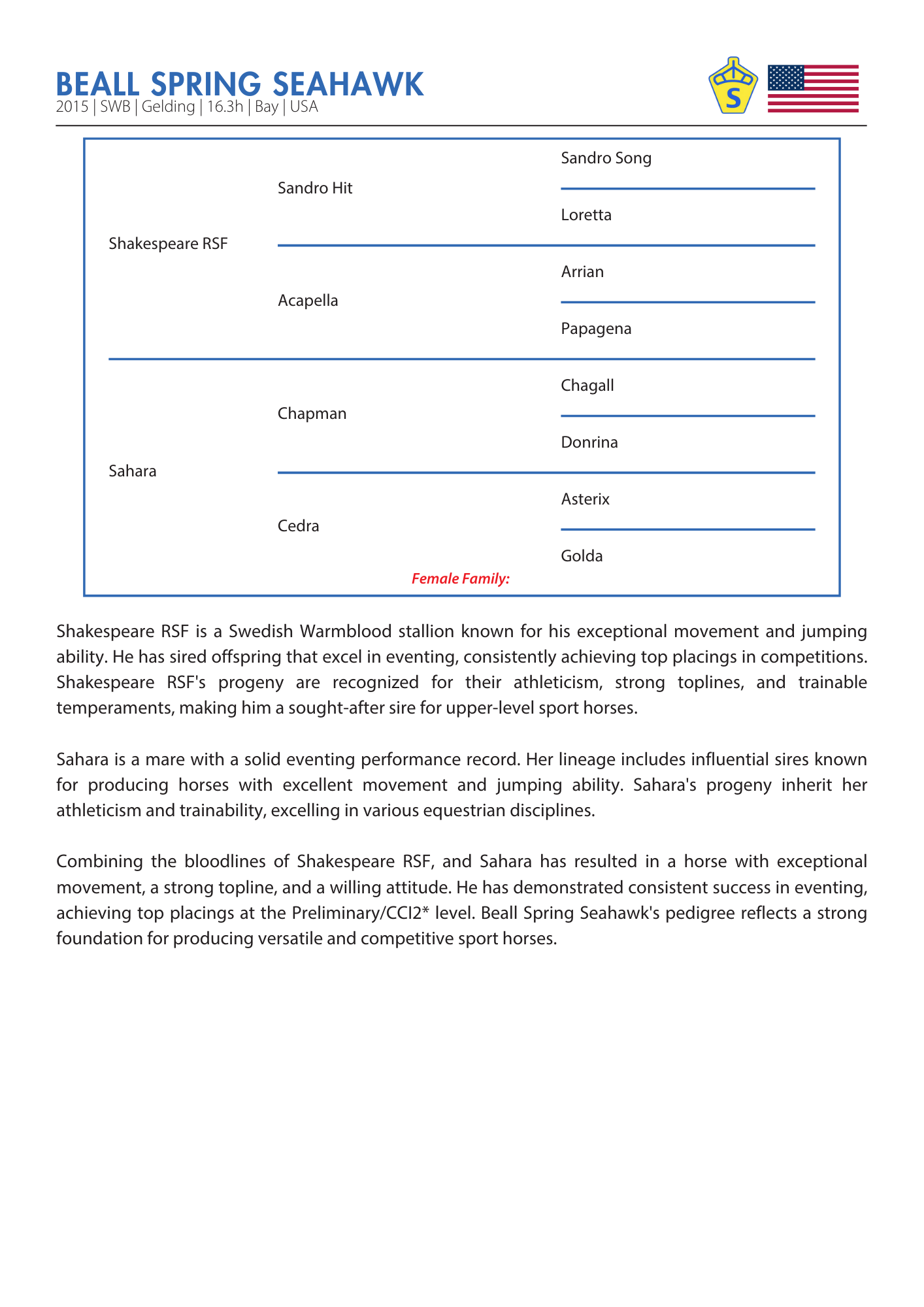 Pedigree: By Shakespeare RSF out of Sahara, bred by Beall Spring Farm