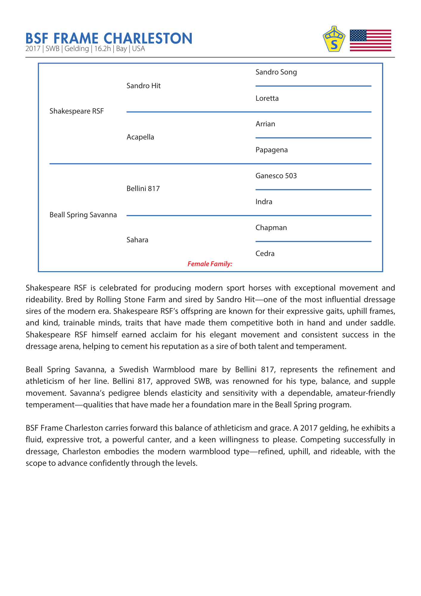 Charleston is an elegant Swedish warmblood gelding with a natural uphill balance and three incredible gaits. Bred by Beall Spring Farm, Charleston’s dam is Beall Spring Savanna and his father is the renowned Shakespeare RSF. Charleston is showing true FEI potential, and he would be a great partner for a professional or serious amateur.