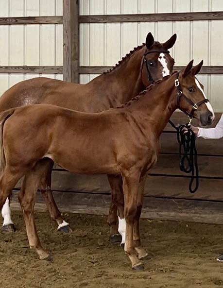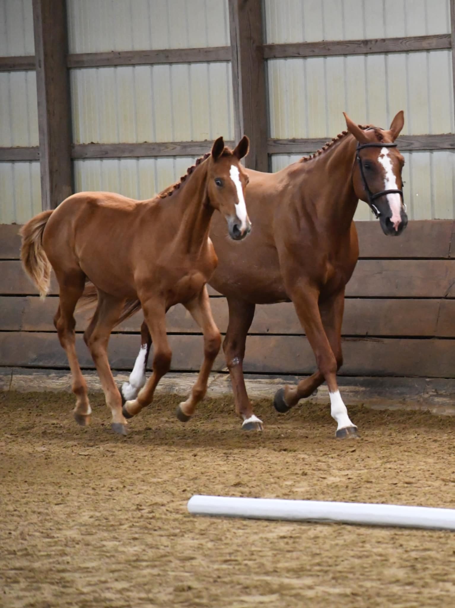 Zara’s temperament matches her pedigree—she’s friendly, calm, bold, and remarkably sensible for her age. Handled daily and well-socialized, she’s easy on the ground and enjoys attention. Judges have described her as a “powerful future sport horse with a strong hind end—confident and bold.”