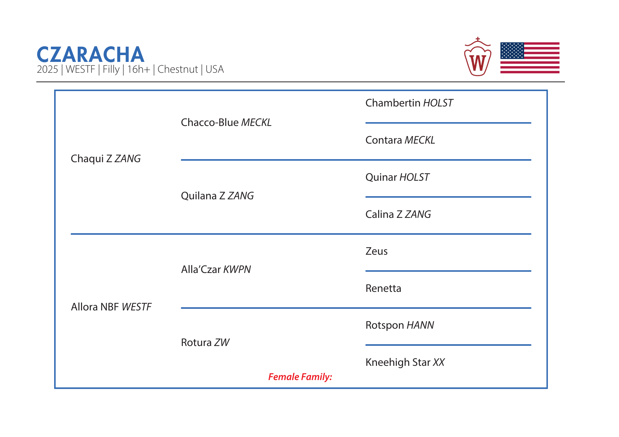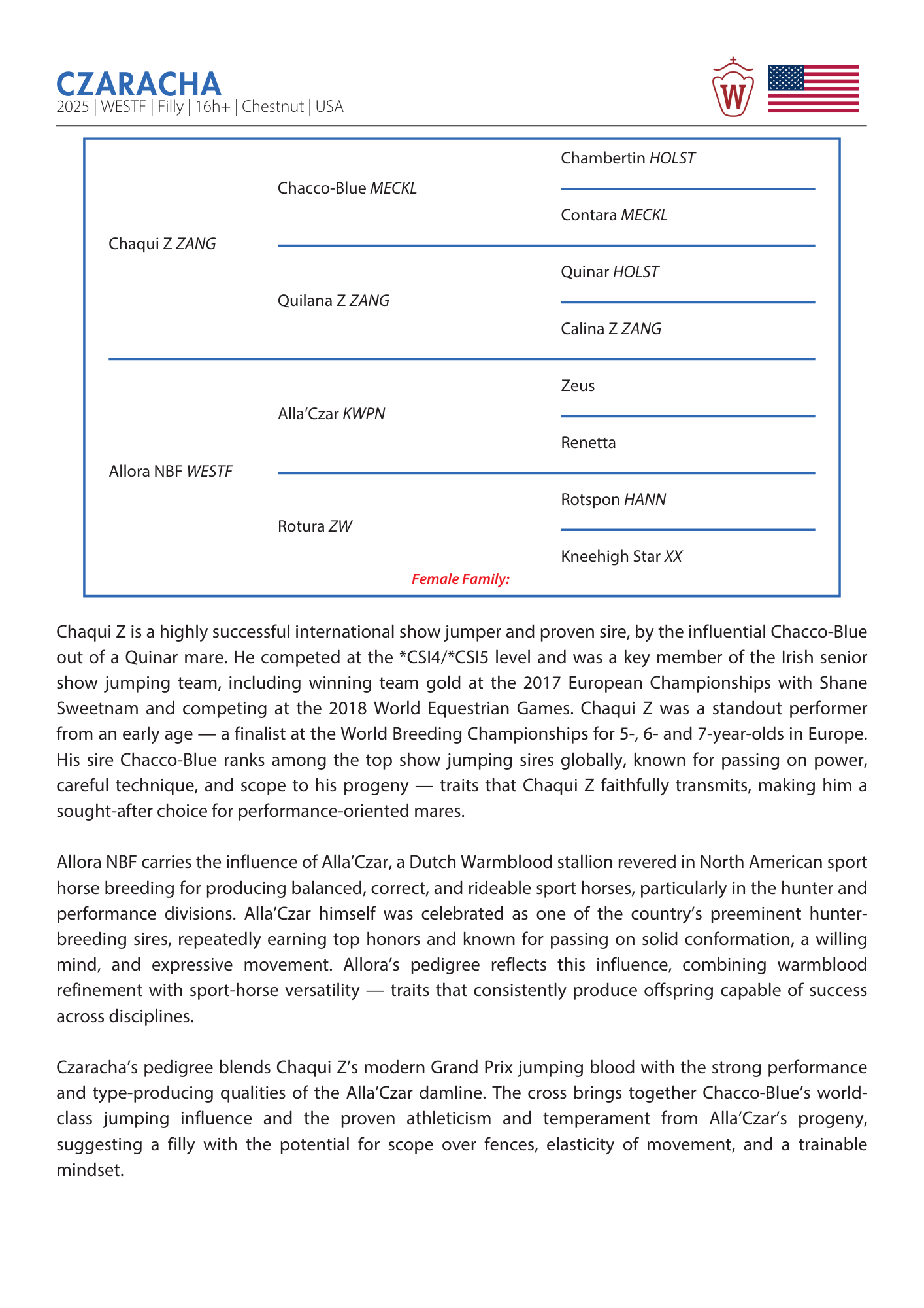Her dam, Allora NBF (Alla’Czar x Rotspon), is a 17h Premium Mare with Westfalen NA, celebrated for her talent and temperament. Allora has proven herself in both hunter and jumper arenas, earning top placings at venues such as HITS, Tryon, and WEC Ohio. Before becoming a broodmare, she was consistent in the 1.10m jumpers and has shown remarkable versatility and class in every ring she’s entered. The influence of Alla’Czar further strengthens Zara’s future as a hunter or jumper. Known for siring beautiful, rideable offspring with expressive movement and correct conformation, Alla’Czar has left a lasting impact on North American sport horse breeding.