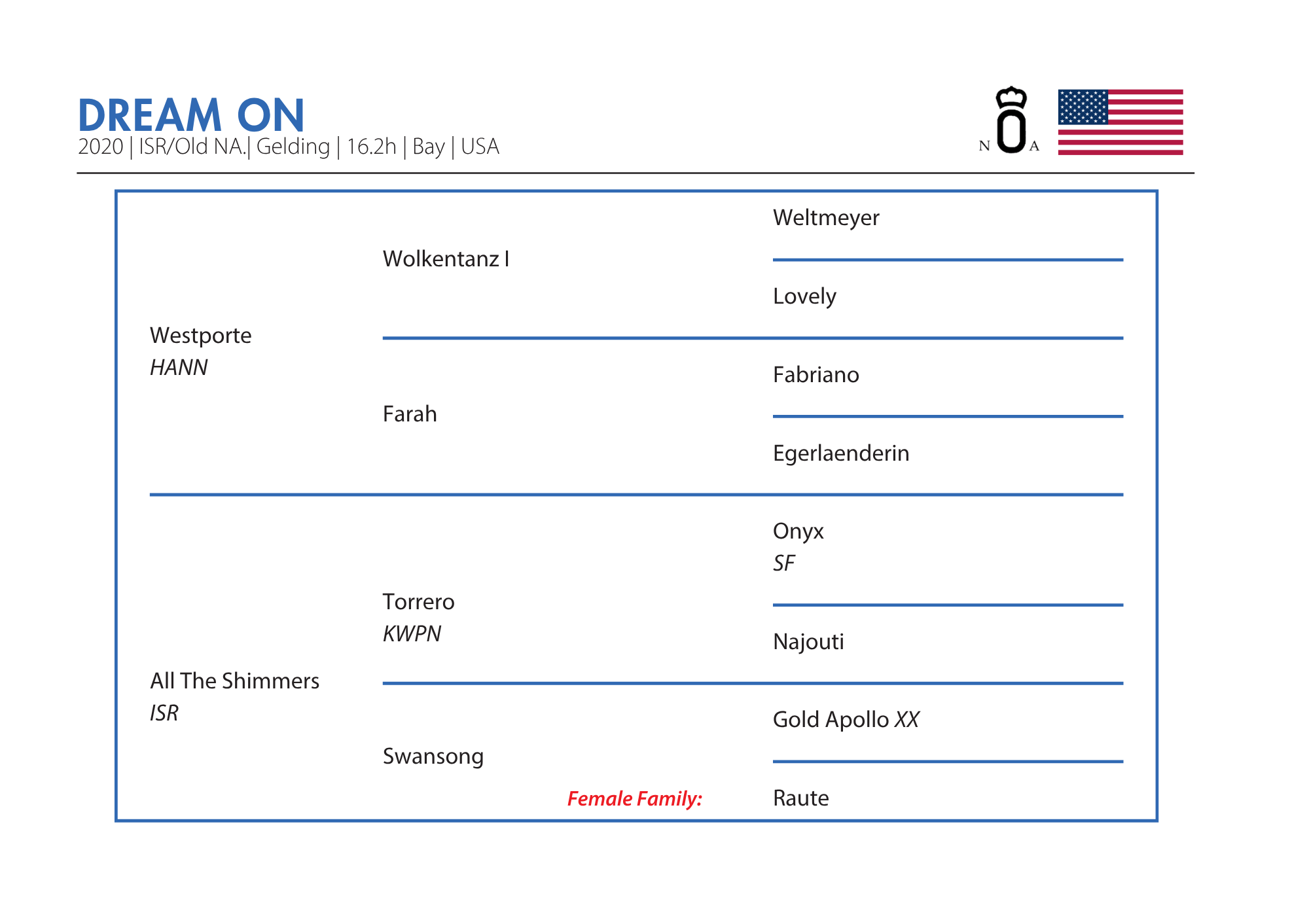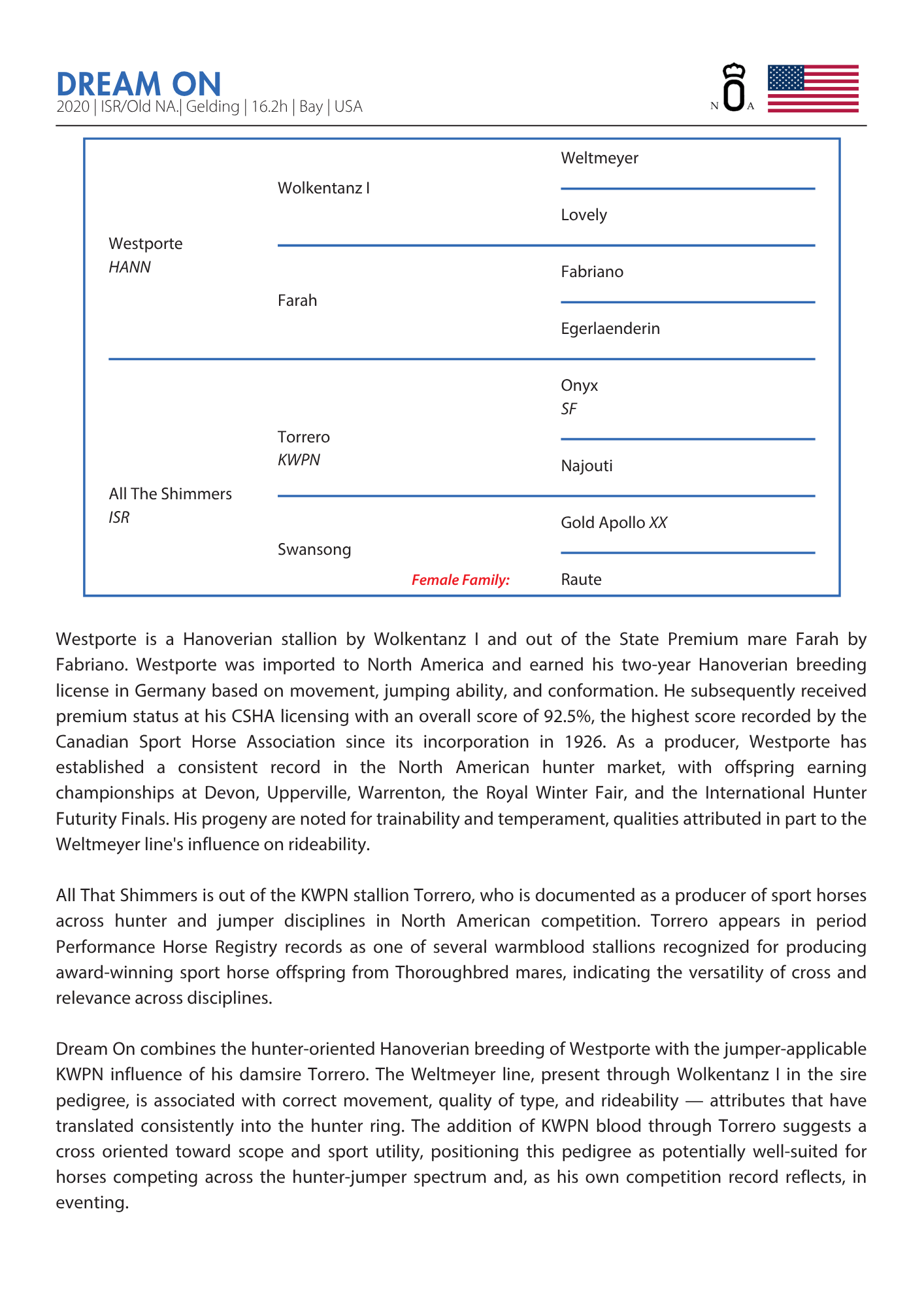 His pedigree further supports his versatility and quality. By Westporte and out of an All That Shimmers (Torrero) mare, Dream On shares a damline with What About Jack, a proven sire known for passing along rideability, temperament, and athletic type. This is a family that consistently produces horses suited for sport, with an emphasis on brain and trainability.