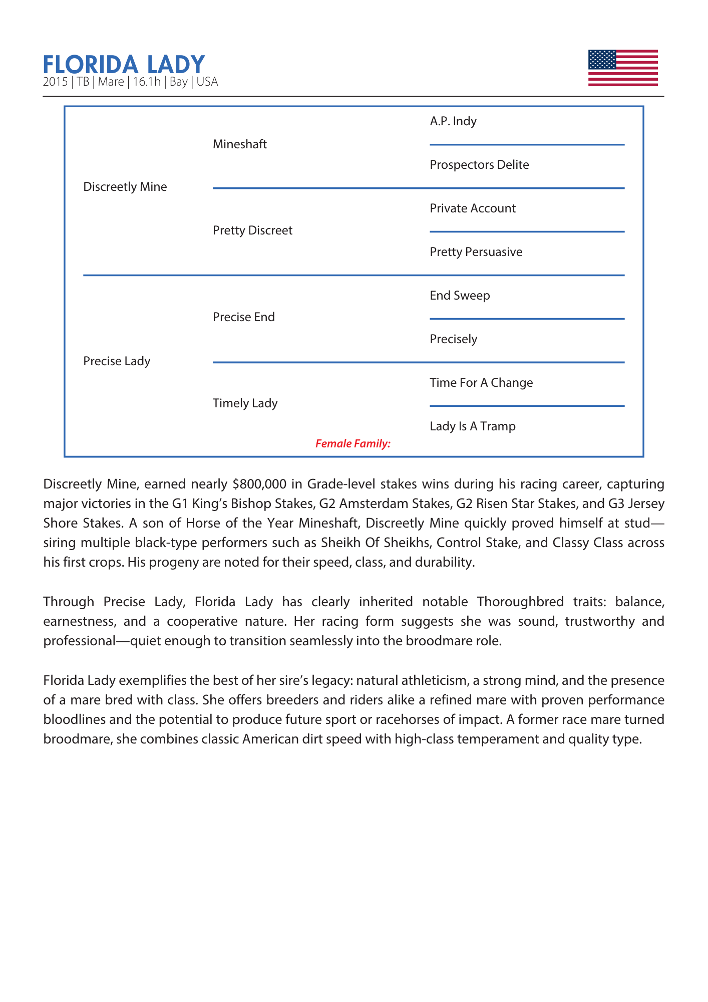 Through Precise Lady, Florida Lady has clearly inherited notable Thoroughbred traits: balance,