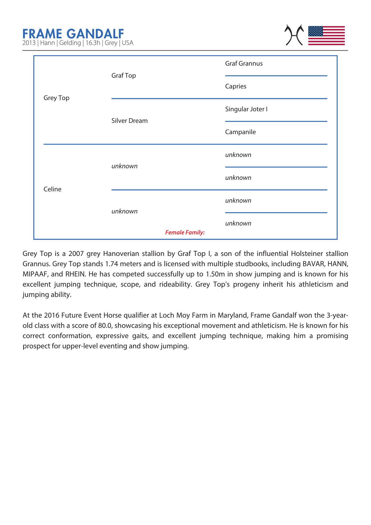 After sourcing him as a youngster, Martin competed Gandalf in the USEA Young Event Horse program before finding his true talent in the hunter/jumper ring. Gandalf developed into a true three-ring horse, successfully competing in the jumpers, equitation and hunters. He is now enjoying continued success in the equitation ring under the guidance of professional Jenn Tirrell of Signature Stables.