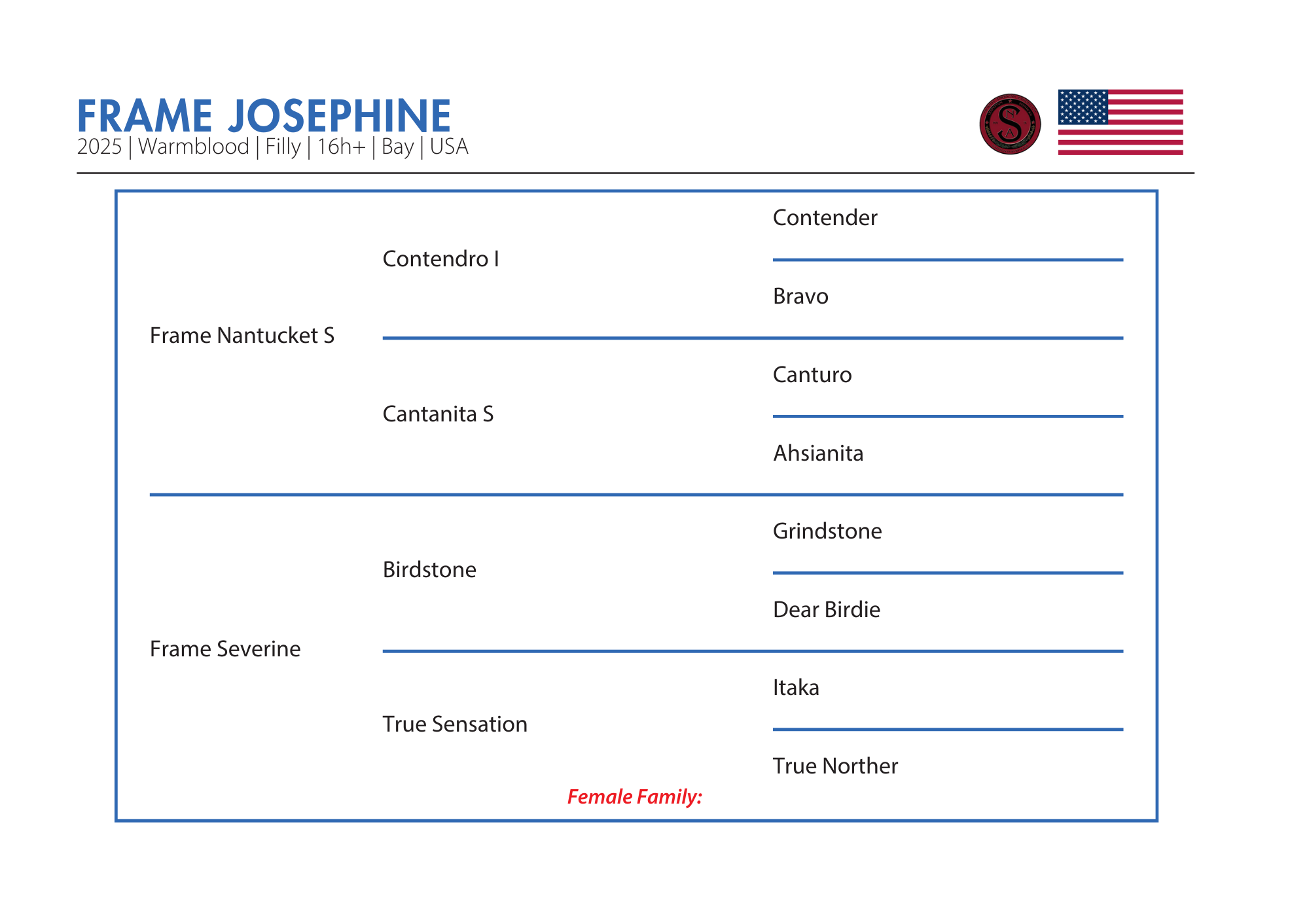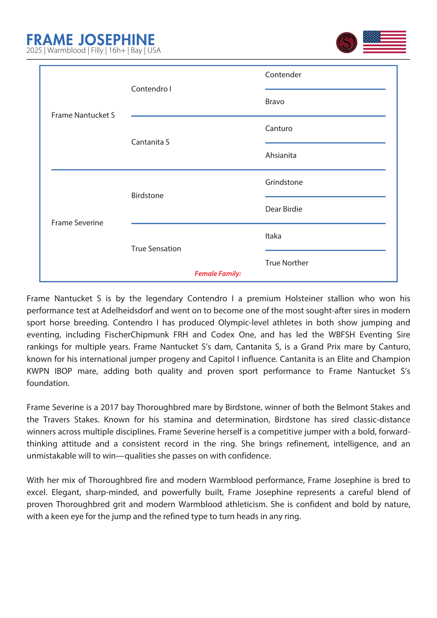 Frame Severine is a 2017 bay Thoroughbred mare by Birdstone, winner of both the Belmont Stakes and the Travers Stakes. Known for his stamina and determination, Birdstone has sired classic-distance winners across multiple disciplines. Frame Severine herself is a competitive jumper with a bold, forward-thinking attitude and a consistent record in the ring. She brings refinement, intelligence, and an unmistakable will to win—qualities she passes on with confidence.