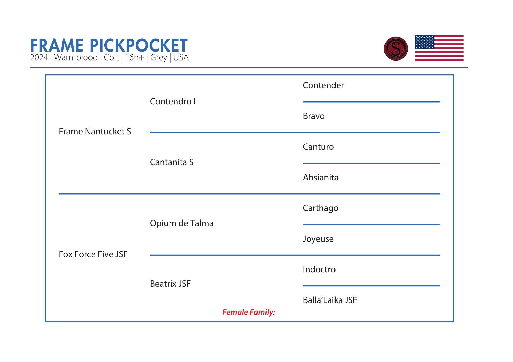 Fox Force Five JSF, is by Opium de Talma an ISO 139 Selle Français stallion who competed successfully in CSI1* and CSI2* and has produced multiple licensed sons and international jumpers. Fox Force Five JSF’s dam, Beatrix JSF, is a refined black mare by Indoctro and is known for her exceptional temperament and proven production record, including derby and jumper champions. With a 3×3 linebreeding to Capitol I, Fox Force Five offers both scope and carefulness, wrapped in a willing and rideable package.