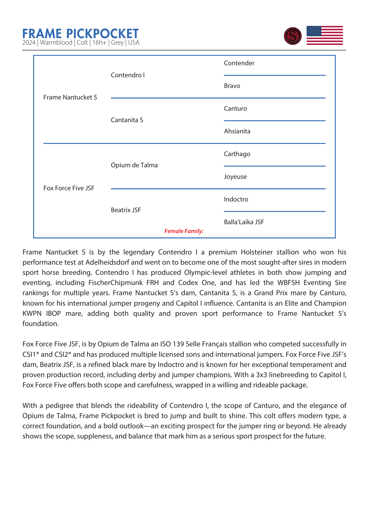 Frame Nantucket S is by the legendary Contendro I a premium Holsteiner stallion who won his performance test at Adelheidsdorf and went on to become one of the most sought-after sires in modern sport horse breeding. Contendro I has produced Olympic-level athletes in both show jumping and eventing, including FischerChipmunk FRH and Codex One, and has led the WBFSH Eventing Sire rankings for multiple years. Frame Nantucket S’s dam, Cantanita S, is a Grand Prix mare by Canturo, known for his international jumper progeny and Capitol I influence. Cantanita is an Elite and Champion KWPN IBOP mare, adding both quality and proven sport performance to Frame Nantucket S’s foundation.