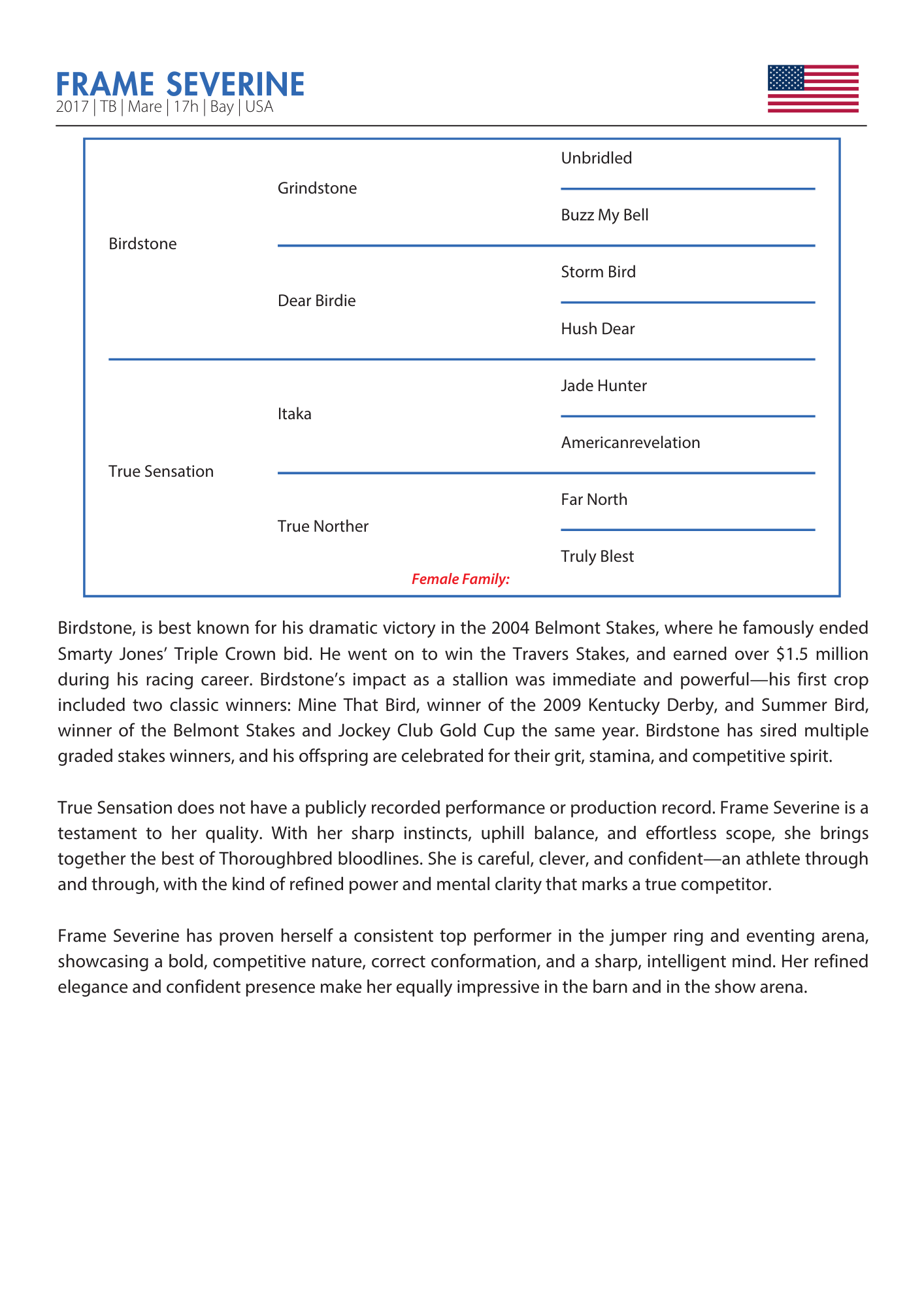 Martin purchased “Sissi” straight off the racetrack, trusting his eye for a quality Thoroughbred mare with the potential to excel in both competition and breeding. Sissi’s bold attitude and competitive nature have made her a consistent top performer in the jumper ring, where her athleticism and fire shine through.