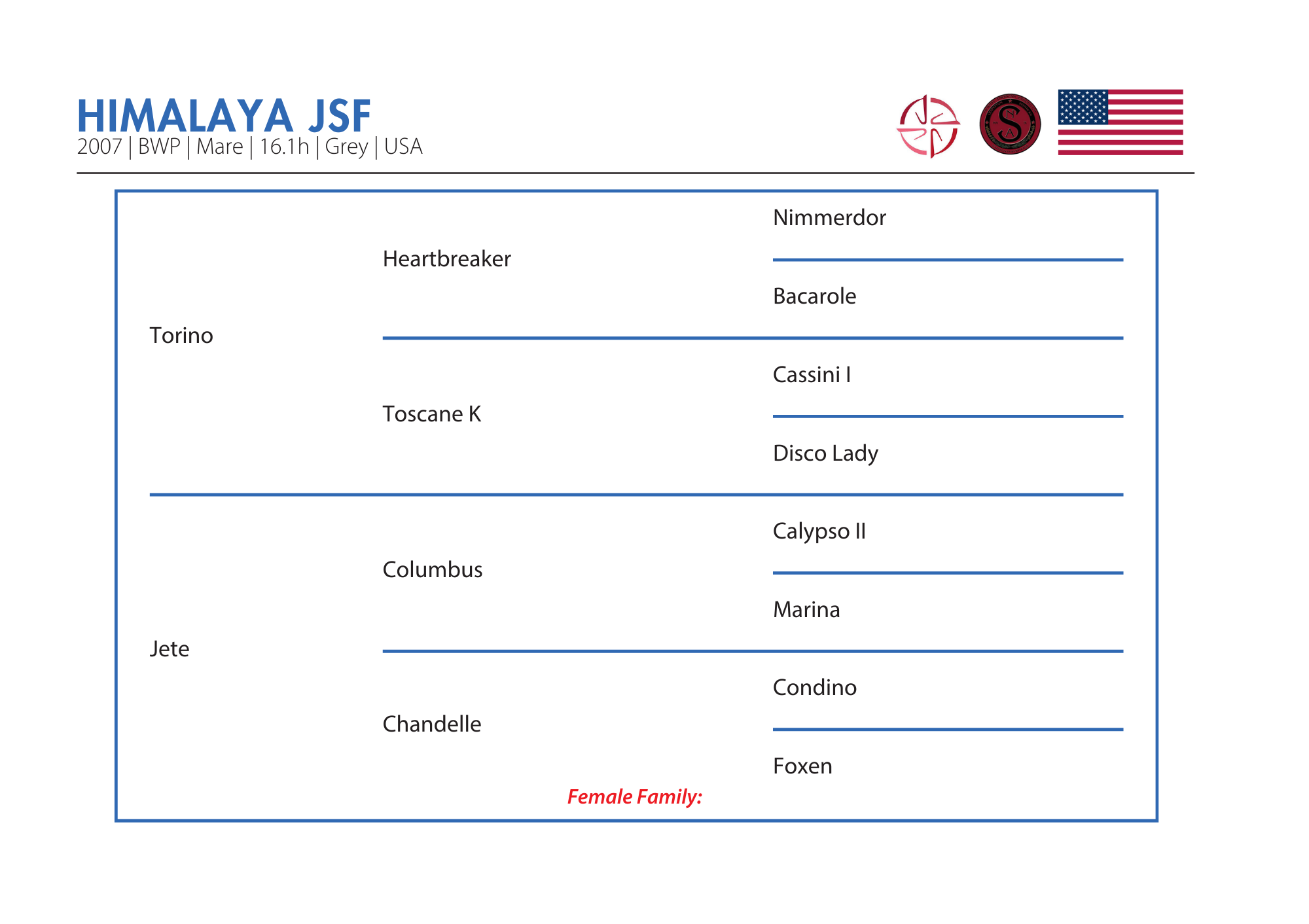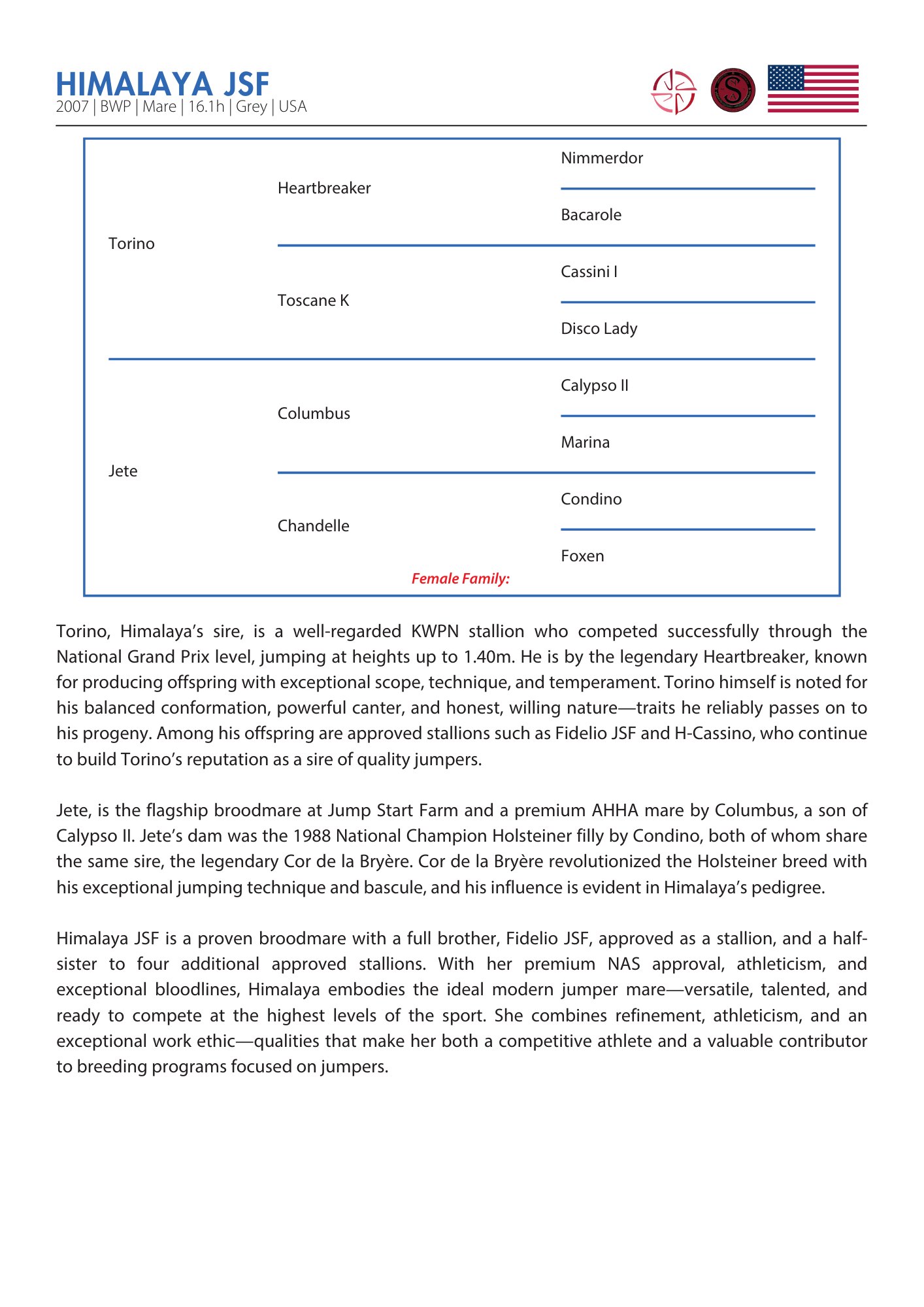 Himalaya JSF is a proven broodmare with a full brother, Fidelio JSF, approved as a stallion, and a half-