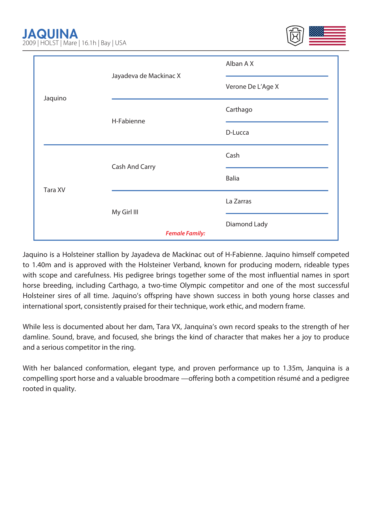 Jaquino is a Holsteiner stallion by Jayadeva de Mackinac out of H-Fabienne. Jaquino himself competed