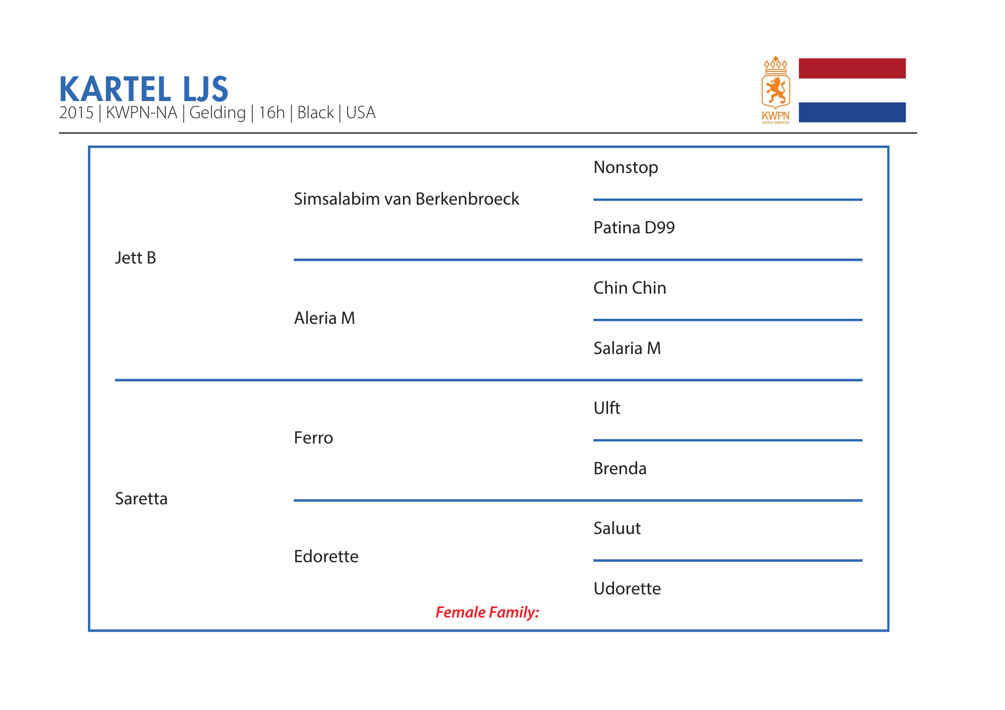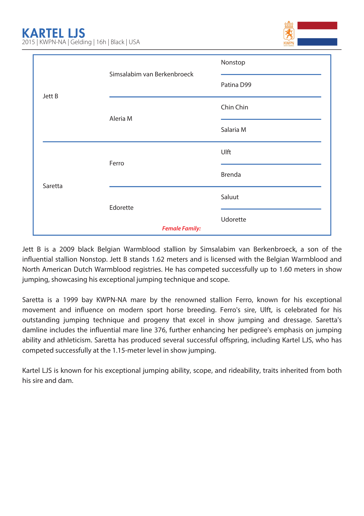 Kartel’s pedigree speaks for itself—sired by Jett B, his bloodlines boast the legendary names of Simsalabim, Darco, Chin Chin, and Nonstop. On the dam side, he carries Olympic Ferro, who secured team silver in Dressage at the 2000 Olympics, and the renowned Maximillian Saluut, a producer of international Grand Prix jumpers. With this combination, Kartel represents the very best of modern Dutch breeding: athletic, versatile, and bred to excel.