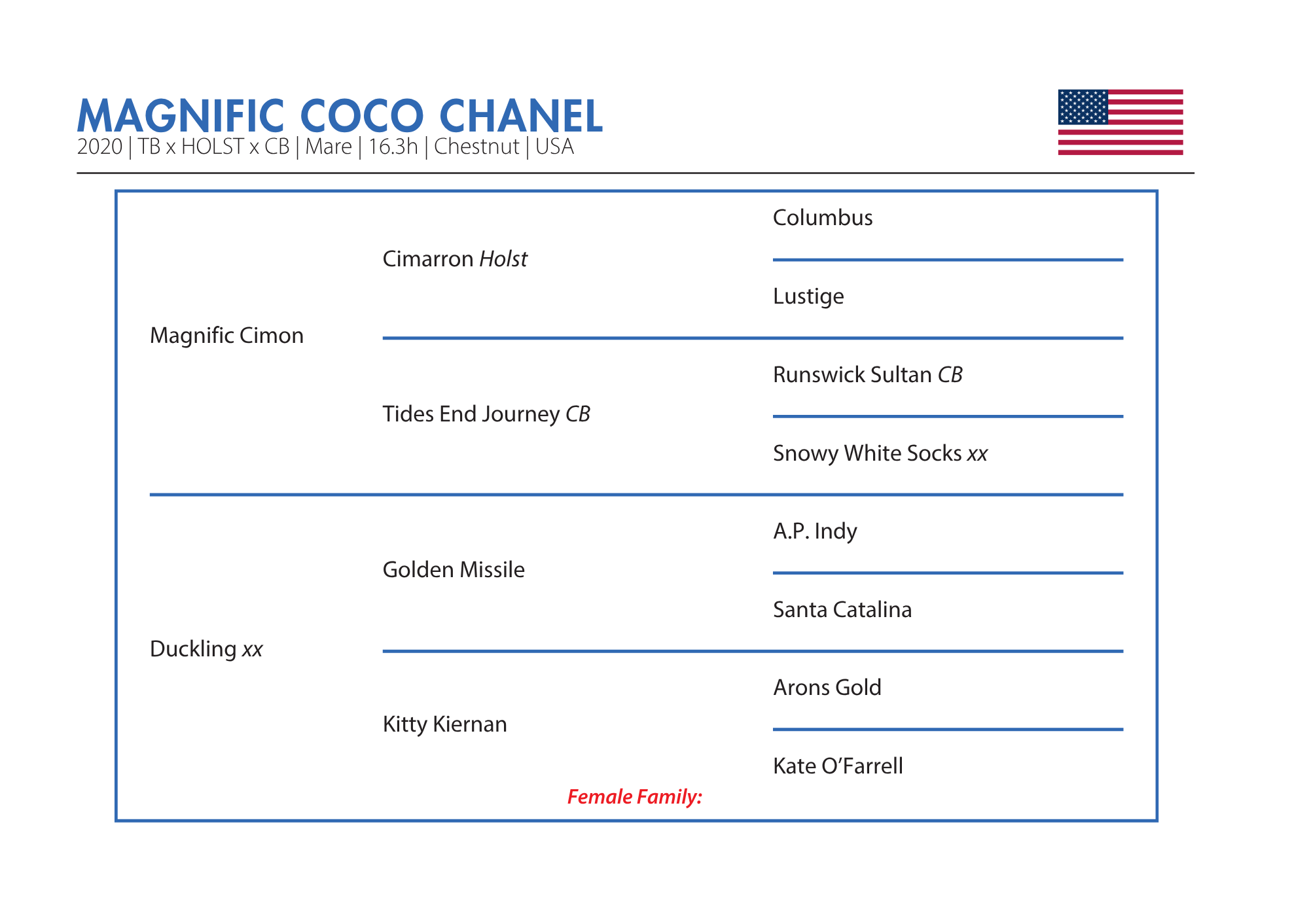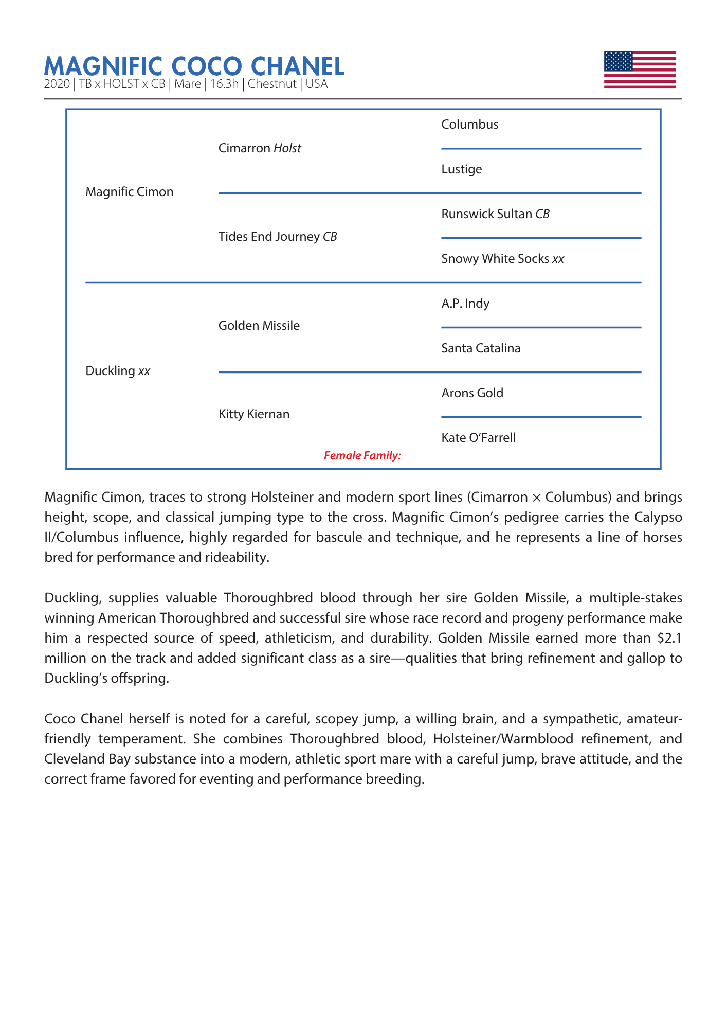 Coco Chanel is a beautifully bred young mare with all the qualities to excel in the sport of your choice. A lovely mover with a sensitive, sweet temperament, Coco Chanel combines elegance, athleticism, and an intelligent mind—hallmarks of her performance-driven pedigree.