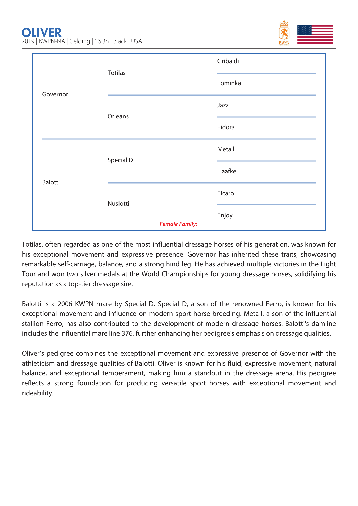 If you’re searching for a horse with presence, movement, and temperament—all wrapped into one stunning package—Oliver might just be your next partner. Bred for performance and elegance, Oliver is by Governor, the highly successful son of Totilas, and out of Balotti, a Special D mare known for producing modern, athletic types. His pedigree is packed with dressage royalty and it shows in his fluid, expressive movement and natural balance.