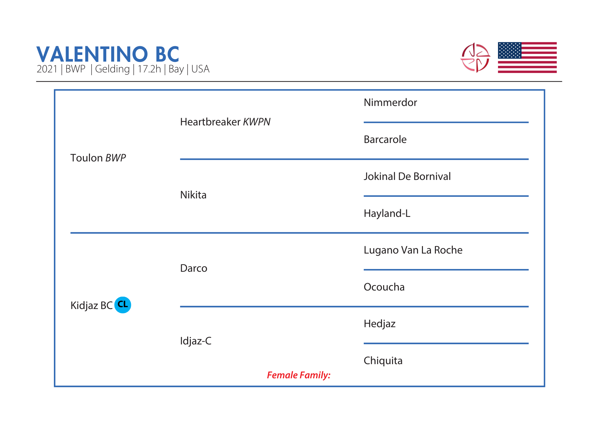Valentino’s pedigree is stacked with proven international jumping power. His sire, Toulon, is a world-class show jumping stallion by the legendary Heartbreaker, known for producing careful, scopey, and highly rideable jumpers that succeed at the upper levels of the sport. Toulon himself competed successfully at CSI4* and CSI5* internationally, including wins on the Global Champions Tour, and his offspring continue to demonstrate athleticism, technique, and competitiveness in top sport.