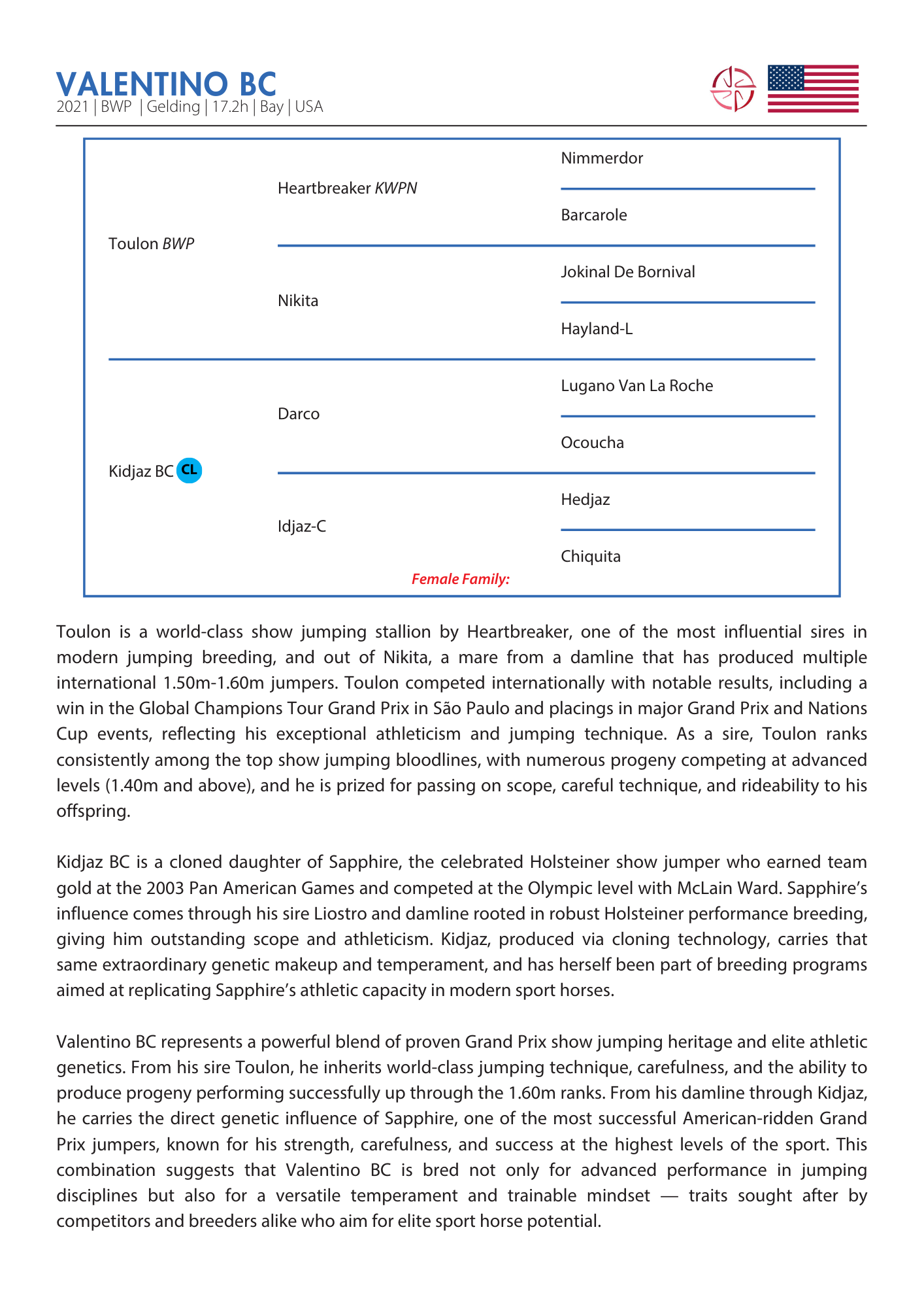 On the dam side, Valentino is out of Kidjaz BC, a clone of the iconic Holsteiner mare Sapphire, McLain Ward’s longtime partner and one of the most celebrated mares in modern show jumping history. Sapphire’s legacy includes multiple championship team medals and consistent international Grand Prix success, making this damline synonymous with durability, scope, and elite performance.