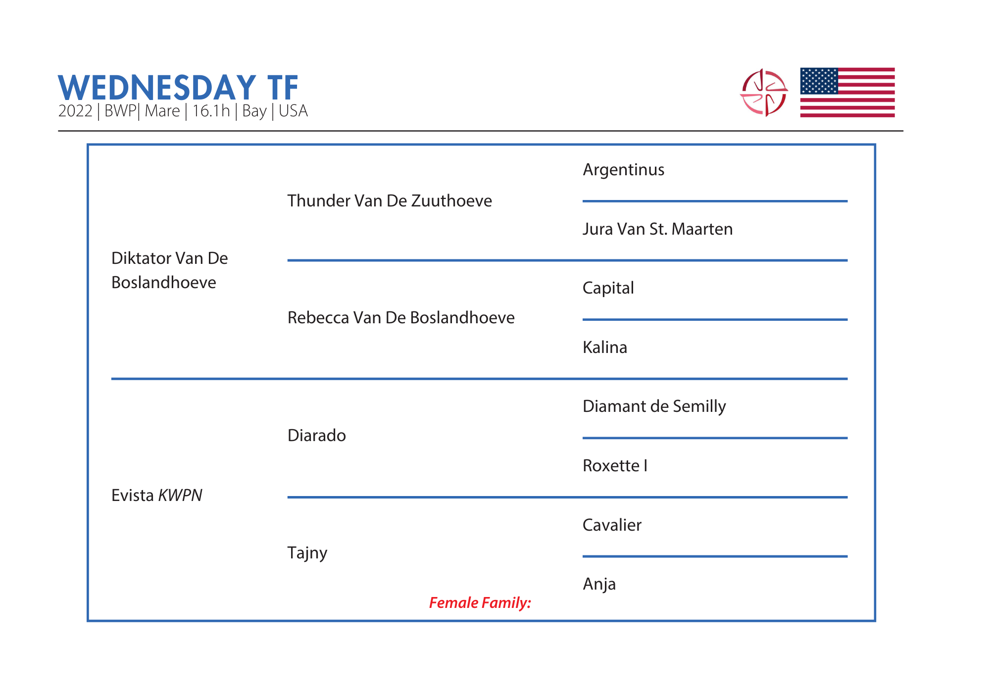 Wednesday is the kind of young horse that checks every box for someone looking to develop a serious hunter-jumper prospect. Bred for both talent and temperament, she combines the modern athleticism of Diktator Van De Boslandhoeve with a proven dam line known for power, rideability, and longevity in sport. Her dam competed successfully to 1.35m in Europe before transitioning to a winning hunter career in the U.S., giving Wednesday a foundation that suits both performance and style.